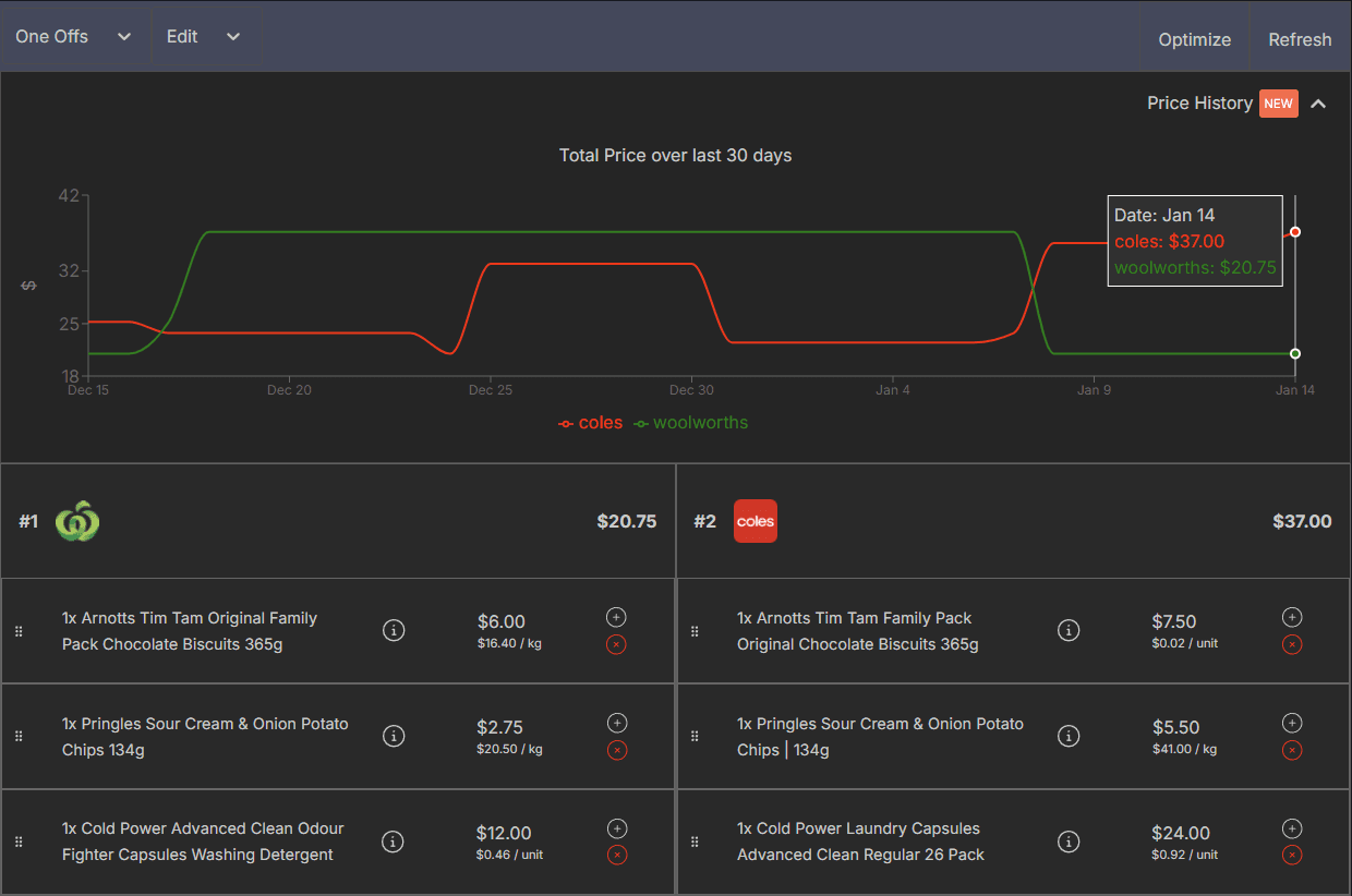 Prefer to cross check with your own preferred products across stores? Create custom shopping lists and see the total cost of your list along with historical total prices to see which weeks your usual store beats others!